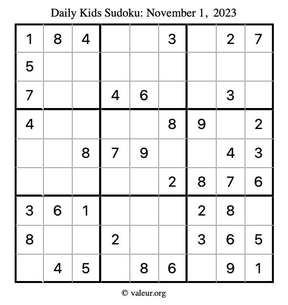 Kids Sudoku November 1, 2023 is not the only sudoku puzzle we have. We create a new kids sudoku puzzle every day for you to print and solve. Check out today's kids sudoku puzzle here!