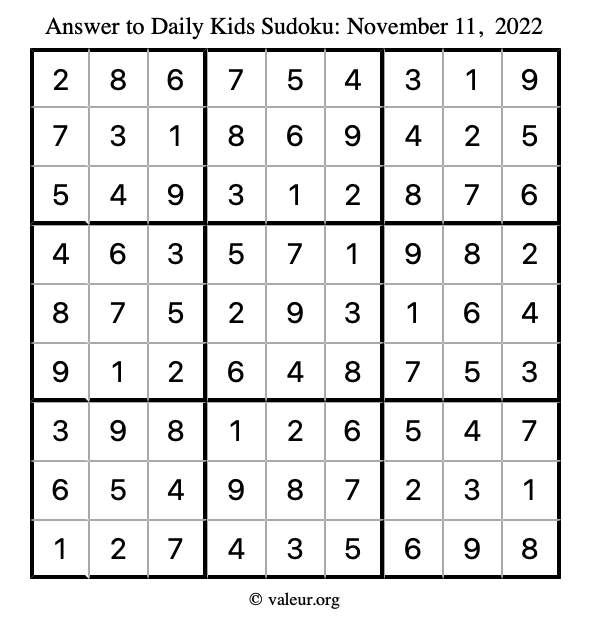 Here is the November 11, 2022 kids sudoku puzzle. You are welcome to print a copy to solve by hand. For your convenience, we have also included the solution further down the page so you can check your work.