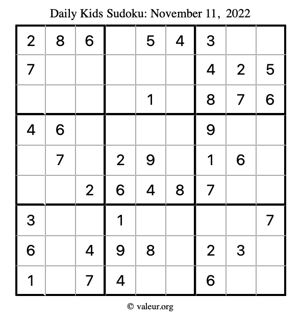 Kids Sudoku November 11, 2022 is not the only sudoku puzzle we have. We create a new kids sudoku puzzle every day for you to print and solve. Check out today's kids sudoku puzzle here!