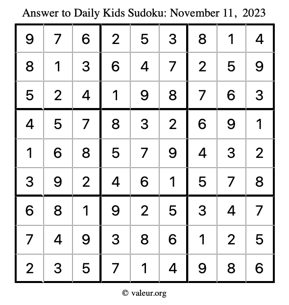 Here is the November 11, 2023 kids sudoku puzzle. You are welcome to print a copy to solve by hand. For your convenience, we have also included the solution further down the page so you can check your work.
