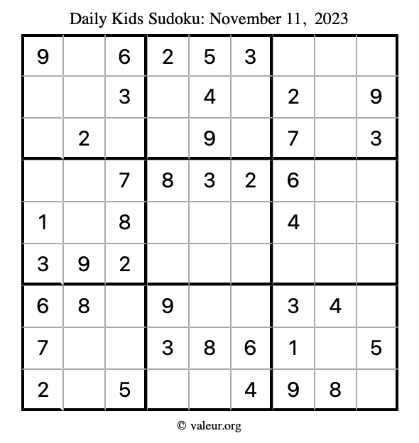Kids Sudoku November 11, 2023 is not the only sudoku puzzle we have. We create a new kids sudoku puzzle every day for you to print and solve. Check out today's kids sudoku puzzle here!