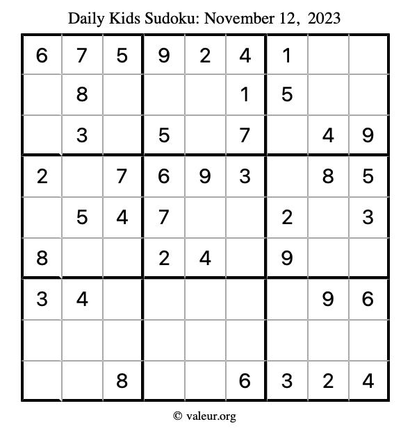 Kids Sudoku November 12, 2023 is not the only sudoku puzzle we have. We create a new kids sudoku puzzle every day for you to print and solve. Check out today's kids sudoku puzzle here!