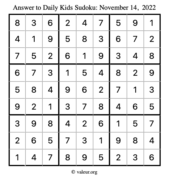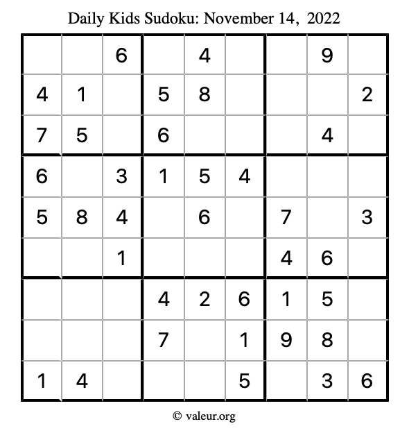 Here is the November 14, 2022 kids sudoku puzzle. You are welcome to print a copy to solve by hand. For your convenience, we have also included the solution further down the page so you can check your work.