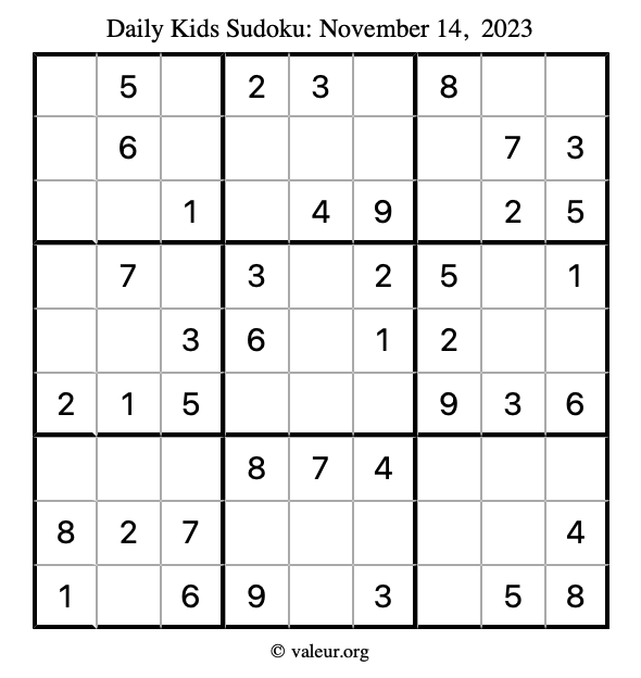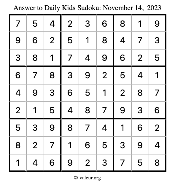 Here is the November 14, 2023 kids sudoku puzzle. You are welcome to print a copy to solve by hand. For your convenience, we have also included the solution further down the page so you can check your work.