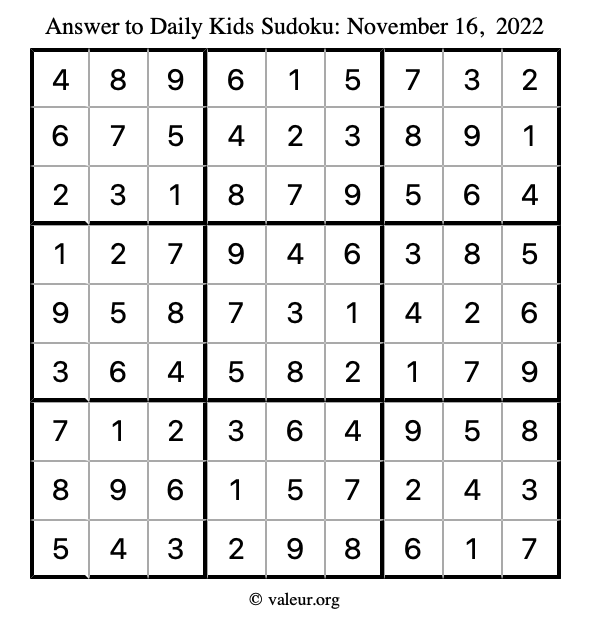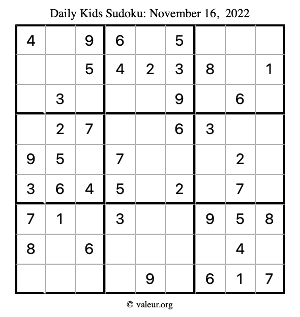 Kids Sudoku November 16, 2022 is not the only sudoku puzzle we have. We create a new kids sudoku puzzle every day for you to print and solve. Check out today's kids sudoku puzzle here!