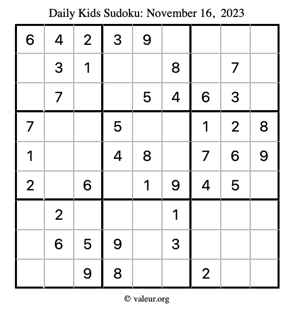 Here is the November 16, 2023 kids sudoku puzzle. You are welcome to print a copy to solve by hand. For your convenience, we have also included the solution further down the page so you can check your work.