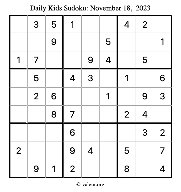 Here is the November 18, 2023 kids sudoku puzzle. You are welcome to print a copy to solve by hand. For your convenience, we have also included the solution further down the page so you can check your work.