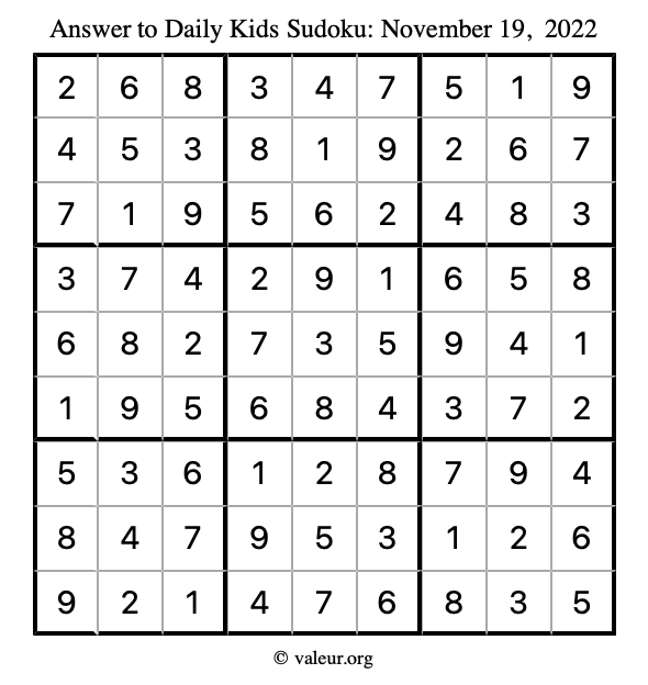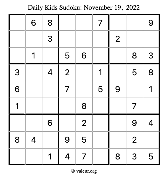 Kids Sudoku November 19, 2022 is not the only sudoku puzzle we have. We create a new kids sudoku puzzle every day for you to print and solve. Check out today's kids sudoku puzzle here!