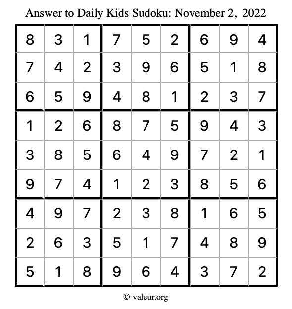 Here is the November 2, 2022 kids sudoku puzzle. You are welcome to print a copy to solve by hand. For your convenience, we have also included the solution further down the page so you can check your work.