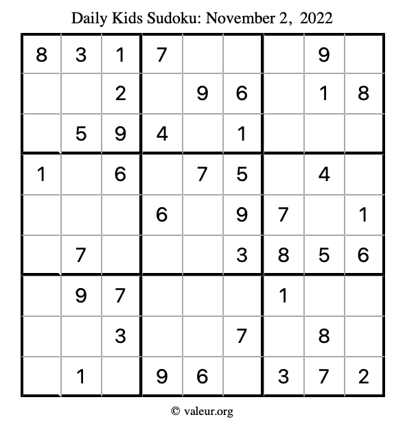 Kids Sudoku November 2, 2022 is not the only sudoku puzzle we have. We create a new kids sudoku puzzle every day for you to print and solve. Check out today's kids sudoku puzzle here!