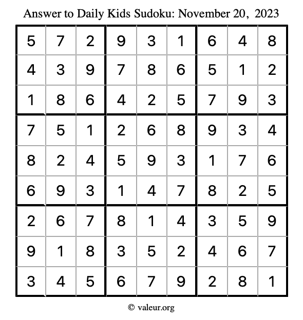 Here is the November 20, 2023 kids sudoku puzzle. You are welcome to print a copy to solve by hand. For your convenience, we have also included the solution further down the page so you can check your work.
