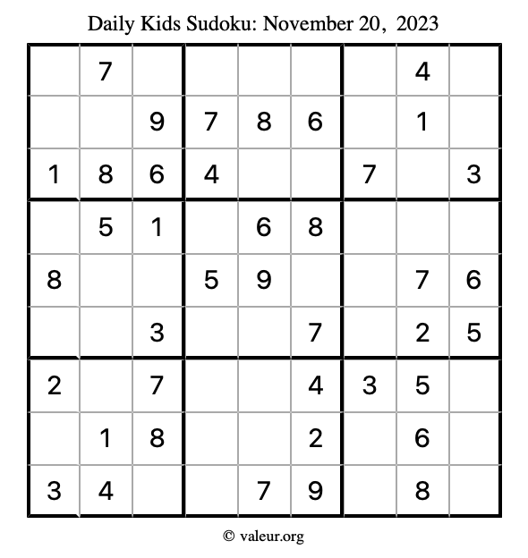 Kids Sudoku November 20, 2023 is not the only sudoku puzzle we have. We create a new kids sudoku puzzle every day for you to print and solve. Check out today's kids sudoku puzzle here!