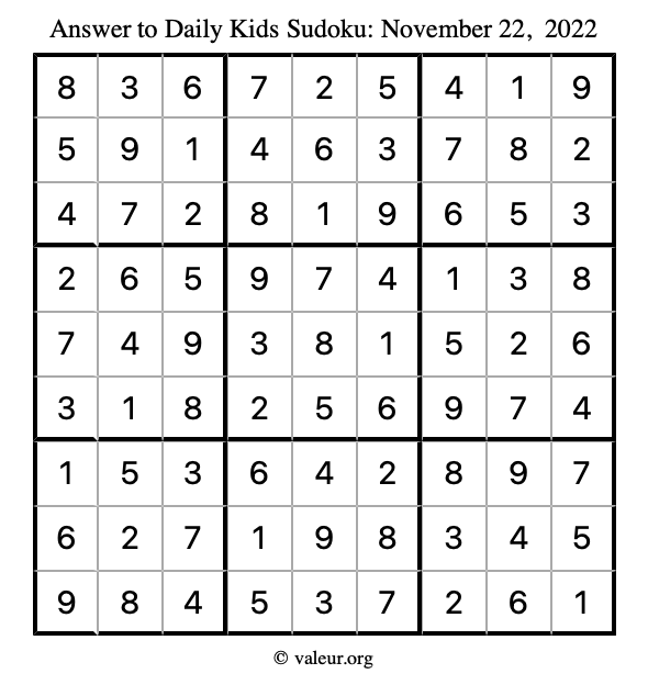 Here is the November 22, 2022 kids sudoku puzzle. You are welcome to print a copy to solve by hand. For your convenience, we have also included the solution further down the page so you can check your work.