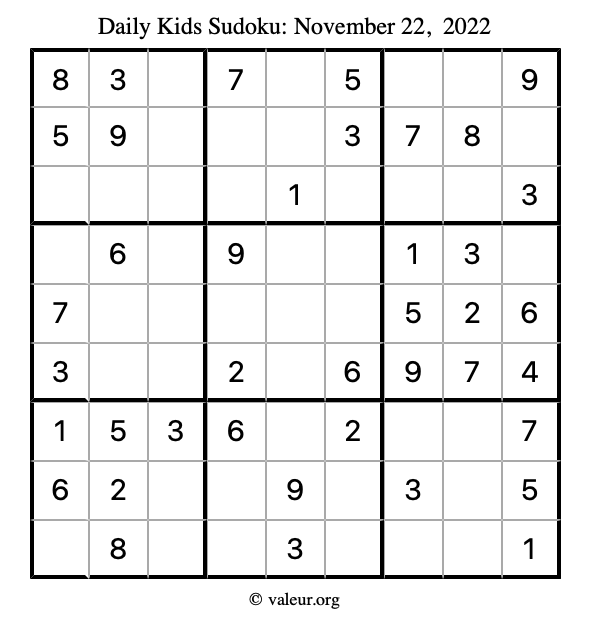 Kids Sudoku November 22, 2022 is not the only sudoku puzzle we have. We create a new kids sudoku puzzle every day for you to print and solve. Check out today's kids sudoku puzzle here!