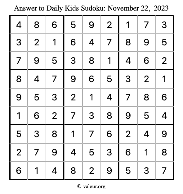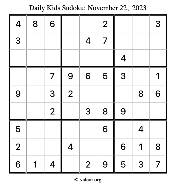 Here is the November 22, 2023 kids sudoku puzzle. You are welcome to print a copy to solve by hand. For your convenience, we have also included the solution further down the page so you can check your work.