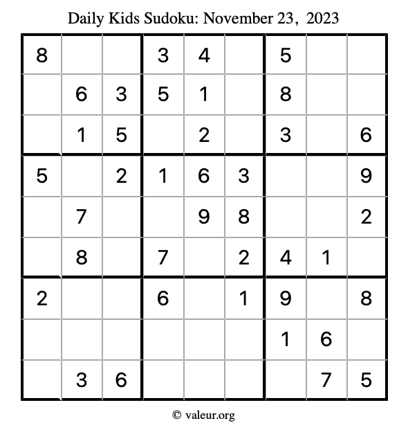Here is the November 23, 2023 kids sudoku puzzle. You are welcome to print a copy to solve by hand. For your convenience, we have also included the solution further down the page so you can check your work.