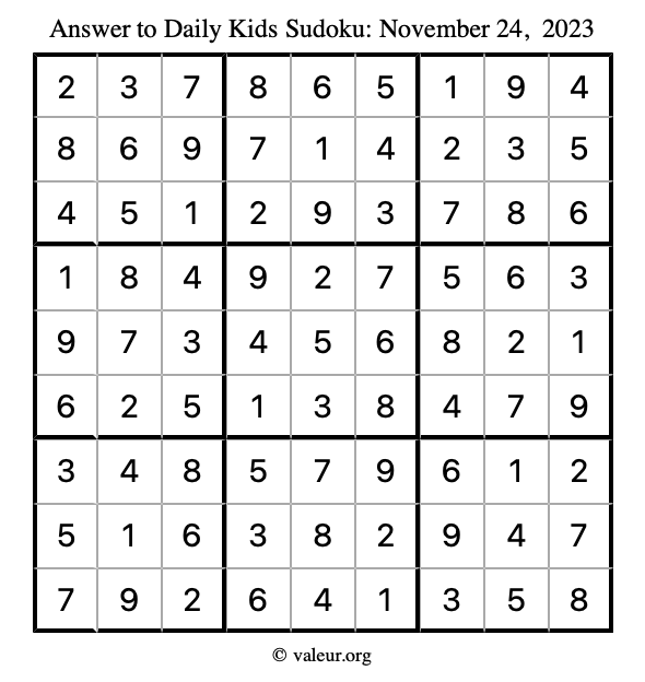 Here is the November 24, 2023 kids sudoku puzzle. You are welcome to print a copy to solve by hand. For your convenience, we have also included the solution further down the page so you can check your work.
