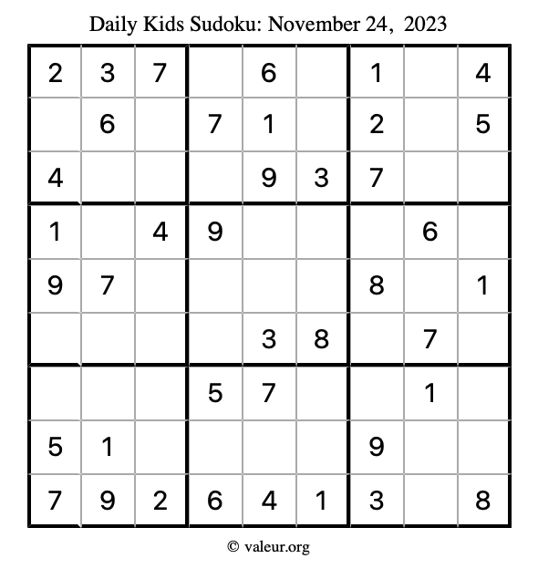 Kids Sudoku November 24, 2023 is not the only sudoku puzzle we have. We create a new kids sudoku puzzle every day for you to print and solve. Check out today's kids sudoku puzzle here!