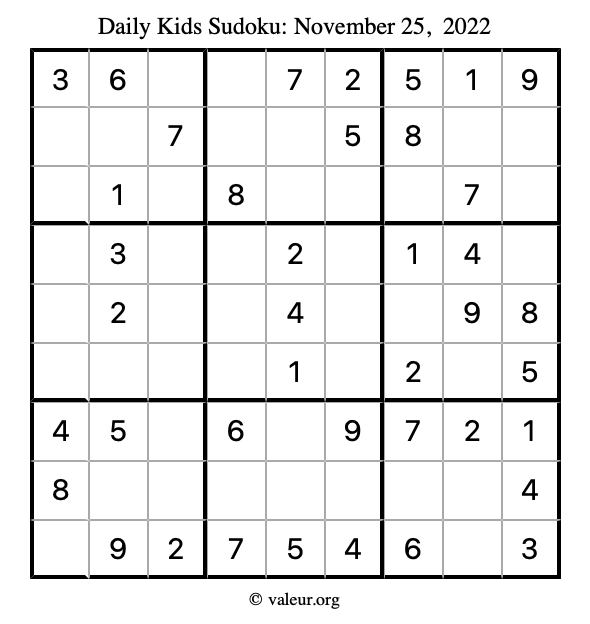 Kids Sudoku November 25, 2022 is not the only sudoku puzzle we have. We create a new kids sudoku puzzle every day for you to print and solve. Check out today's kids sudoku puzzle here!
