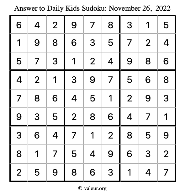 Here is the November 26, 2022 kids sudoku puzzle. You are welcome to print a copy to solve by hand. For your convenience, we have also included the solution further down the page so you can check your work.
