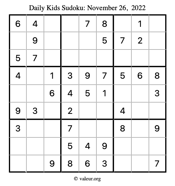 Kids Sudoku November 26, 2022 is not the only sudoku puzzle we have. We create a new kids sudoku puzzle every day for you to print and solve. Check out today's kids sudoku puzzle here!