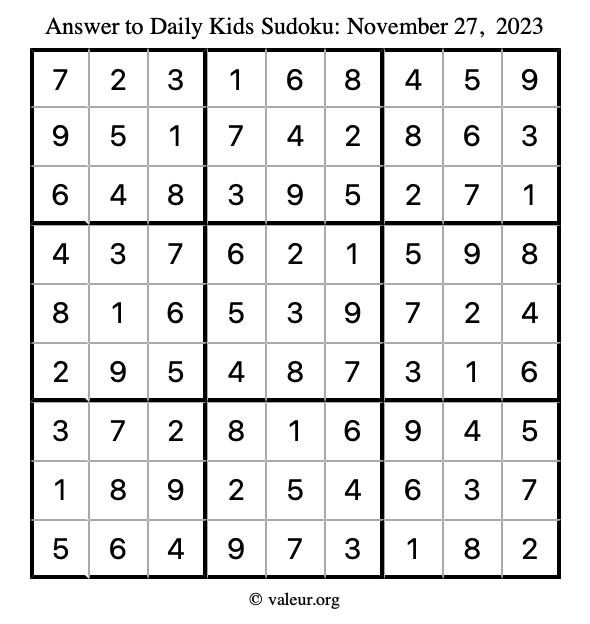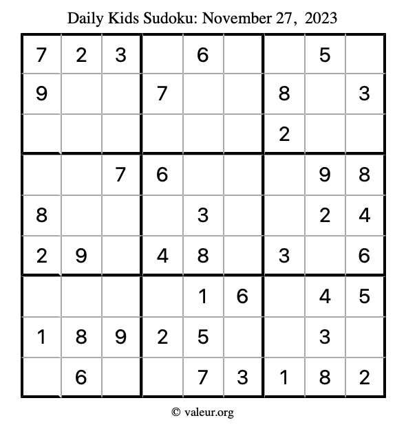 Here is the November 27, 2023 kids sudoku puzzle. You are welcome to print a copy to solve by hand. For your convenience, we have also included the solution further down the page so you can check your work.