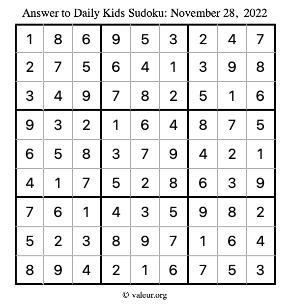 Here is the November 28, 2022 kids sudoku puzzle. You are welcome to print a copy to solve by hand. For your convenience, we have also included the solution further down the page so you can check your work.