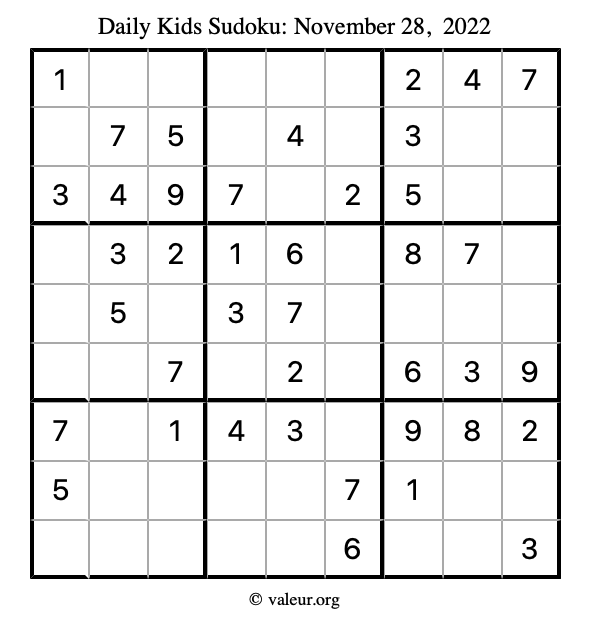Kids Sudoku November 28, 2022 is not the only sudoku puzzle we have. We create a new kids sudoku puzzle every day for you to print and solve. Check out today's kids sudoku puzzle here!
