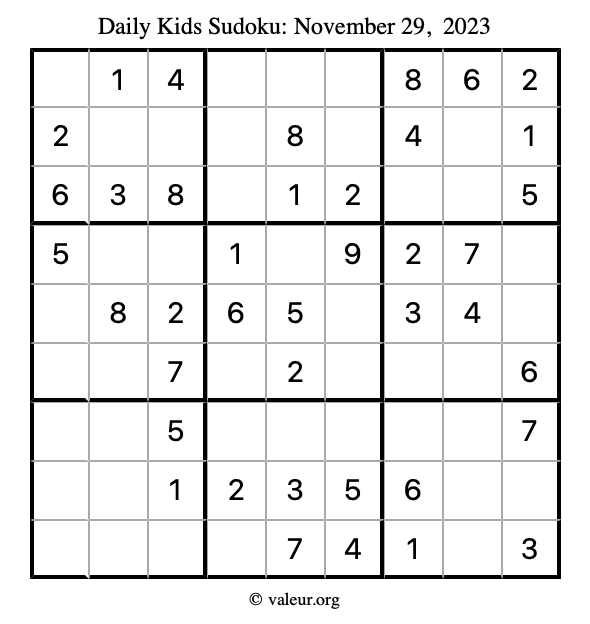 Here is the November 29, 2023 kids sudoku puzzle. You are welcome to print a copy to solve by hand. For your convenience, we have also included the solution further down the page so you can check your work.