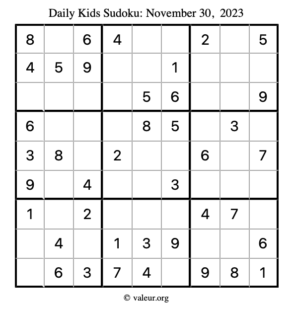 Kids Sudoku November 30, 2023 is not the only sudoku puzzle we have. We create a new kids sudoku puzzle every day for you to print and solve. Check out today's kids sudoku puzzle here!