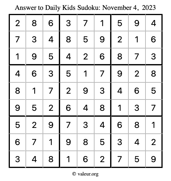Here is the November 4, 2023 kids sudoku puzzle. You are welcome to print a copy to solve by hand. For your convenience, we have also included the solution further down the page so you can check your work.