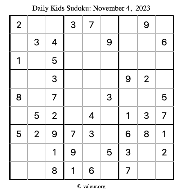 Kids Sudoku November 4, 2023 is not the only sudoku puzzle we have. We create a new kids sudoku puzzle every day for you to print and solve. Check out today's kids sudoku puzzle here!