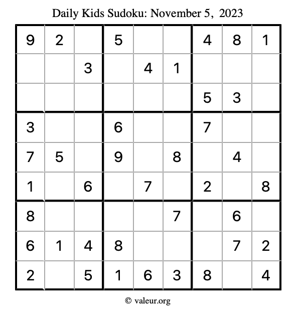 Kids Sudoku November 5, 2023 is not the only sudoku puzzle we have. We create a new kids sudoku puzzle every day for you to print and solve. Check out today's kids sudoku puzzle here!