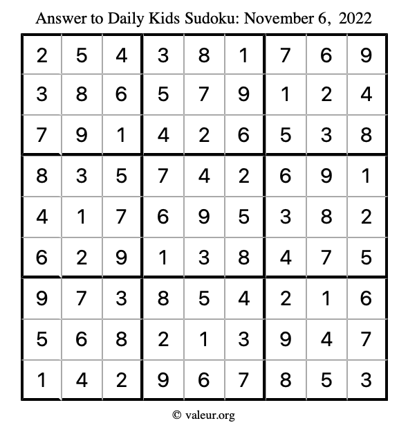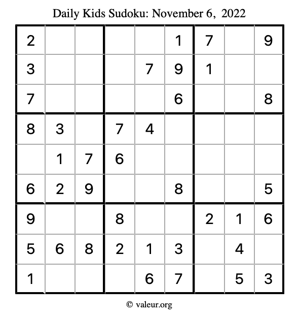 Kids Sudoku November 6, 2022 is not the only sudoku puzzle we have. We create a new kids sudoku puzzle every day for you to print and solve. Check out today's kids sudoku puzzle here!