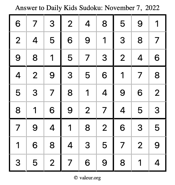 Here is the November 7, 2022 kids sudoku puzzle. You are welcome to print a copy to solve by hand. For your convenience, we have also included the solution further down the page so you can check your work.