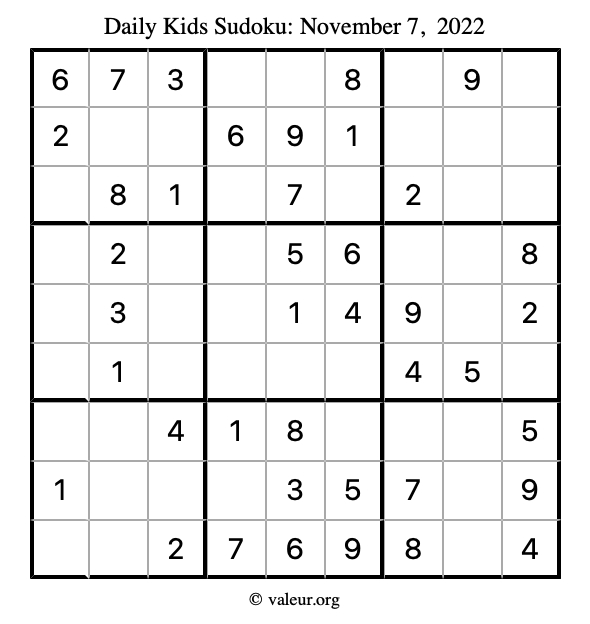 Kids Sudoku November 7, 2022 is not the only sudoku puzzle we have. We create a new kids sudoku puzzle every day for you to print and solve. Check out today's kids sudoku puzzle here!