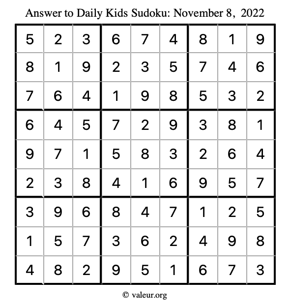 Here is the November 8, 2022 kids sudoku puzzle. You are welcome to print a copy to solve by hand. For your convenience, we have also included the solution further down the page so you can check your work.