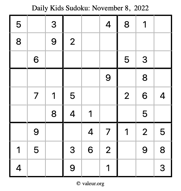 Kids Sudoku November 8, 2022 is not the only sudoku puzzle we have. We create a new kids sudoku puzzle every day for you to print and solve. Check out today's kids sudoku puzzle here!