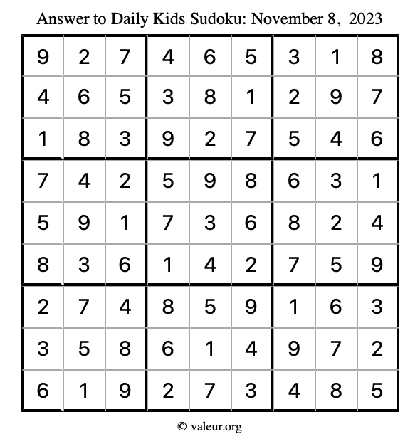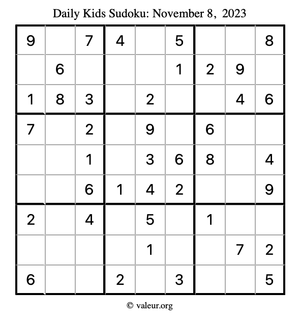 Here is the November 8, 2023 kids sudoku puzzle. You are welcome to print a copy to solve by hand. For your convenience, we have also included the solution further down the page so you can check your work.