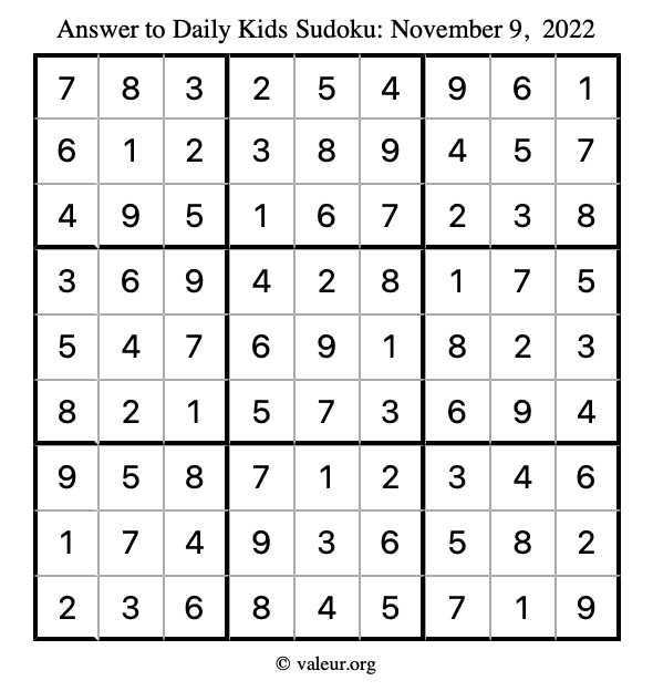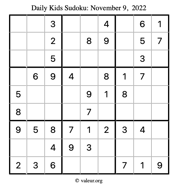 Here is the November 9, 2022 kids sudoku puzzle. You are welcome to print a copy to solve by hand. For your convenience, we have also included the solution further down the page so you can check your work.