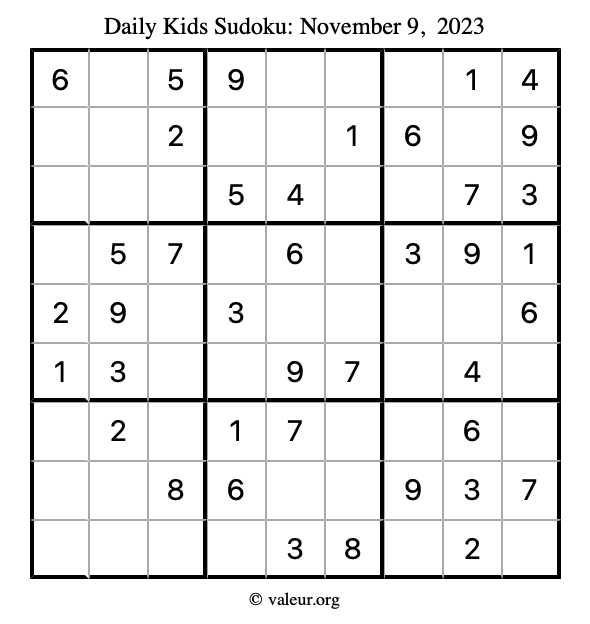 Here is the November 9, 2023 kids sudoku puzzle. You are welcome to print a copy to solve by hand. For your convenience, we have also included the solution further down the page so you can check your work.