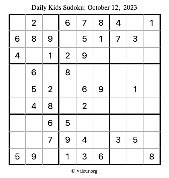 Here is the October 12, 2023 kids sudoku puzzle. You are welcome to print a copy to solve by hand. For your convenience, we have also included the solution further down the page so you can check your work.