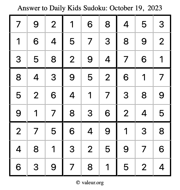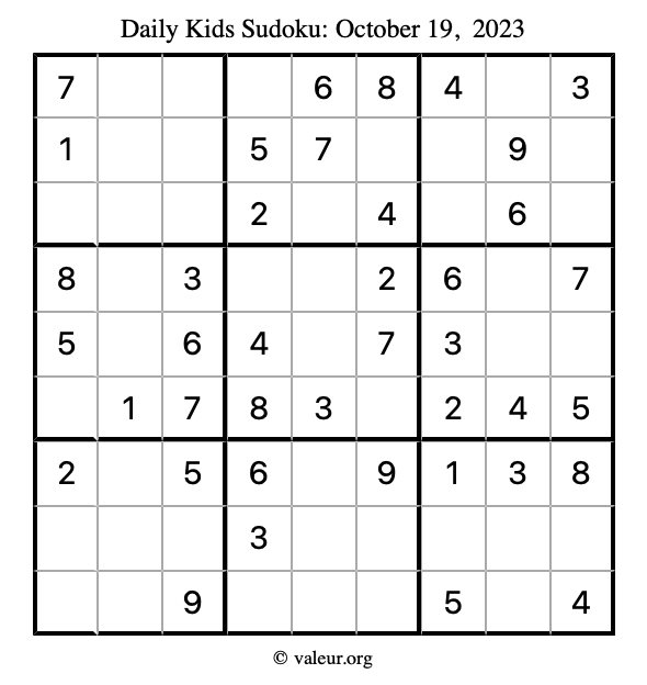 Here is the October 19, 2023 kids sudoku puzzle. You are welcome to print a copy to solve by hand. For your convenience, we have also included the solution further down the page so you can check your work.