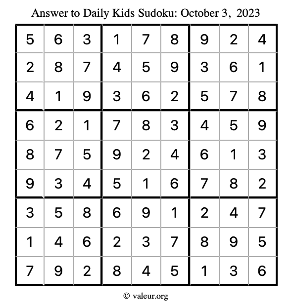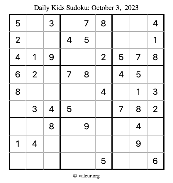 Here is the October 3, 2023 kids sudoku puzzle. You are welcome to print a copy to solve by hand. For your convenience, we have also included the solution further down the page so you can check your work.