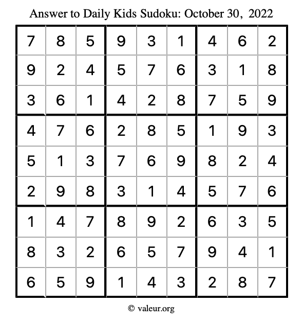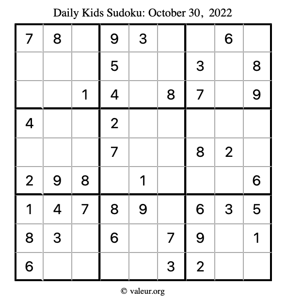 Here is the October 30, 2022 kids sudoku puzzle. You are welcome to print a copy to solve by hand. For your convenience, we have also included the solution further down the page so you can check your work.