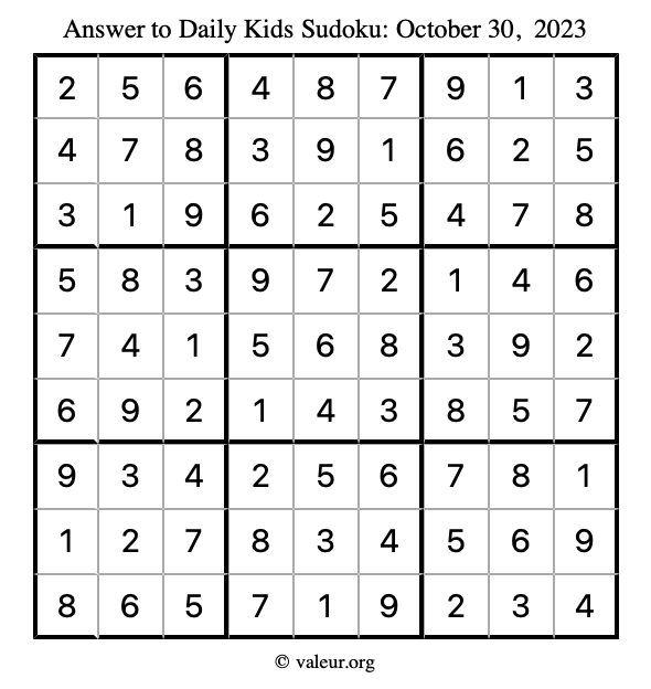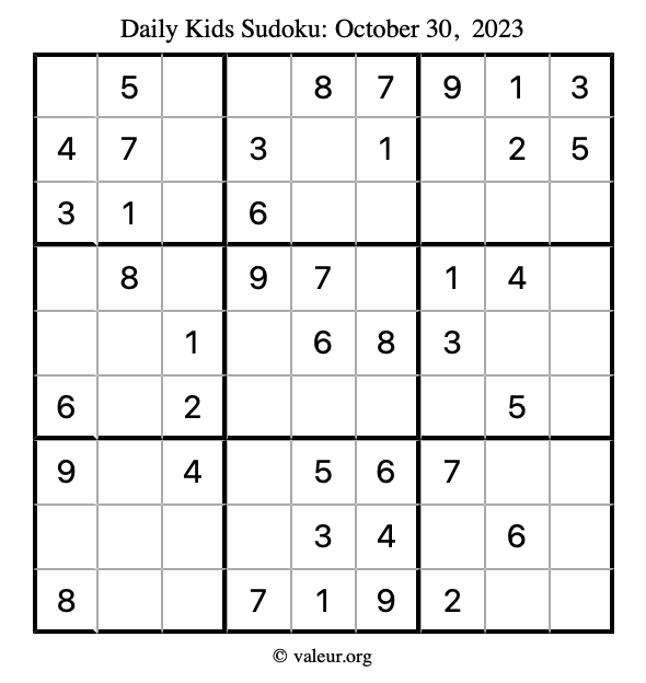 Kids Sudoku October 30, 2023 is not the only sudoku puzzle we have. We create a new kids sudoku puzzle every day for you to print and solve. Check out today's kids sudoku puzzle here!
