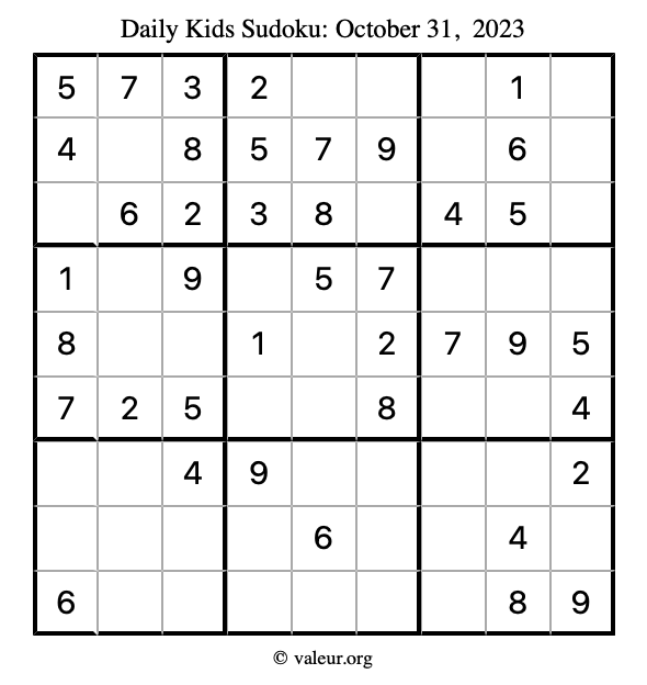 Kids Sudoku October 31, 2023 is not the only sudoku puzzle we have. We create a new kids sudoku puzzle every day for you to print and solve. Check out today's kids sudoku puzzle here!