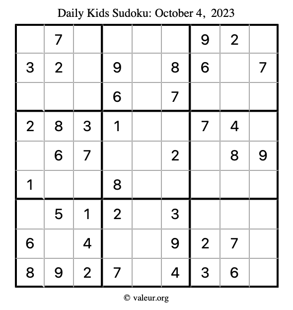 Kids Sudoku October 4, 2023 is not the only sudoku puzzle we have. We create a new kids sudoku puzzle every day for you to print and solve. Check out today's kids sudoku puzzle here!