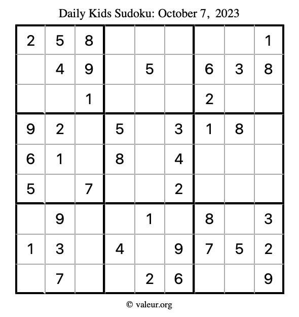 Kids Sudoku October 7, 2023 is not the only sudoku puzzle we have. We create a new kids sudoku puzzle every day for you to print and solve. Check out today's kids sudoku puzzle here!