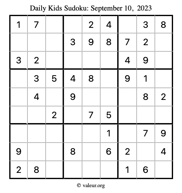 Kids Sudoku September 10, 2023 is not the only sudoku puzzle we have. We create a new kids sudoku puzzle every day for you to print and solve. Check out today's kids sudoku puzzle here!